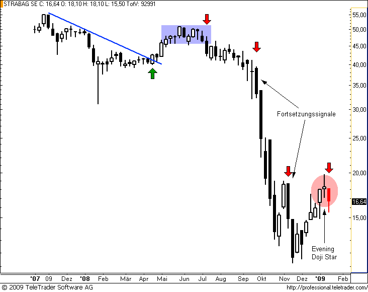 Charttechnischer Ausblick 18.01.09: STRABAG ist zwar noch nicht lange genug an der Börse für einen weit zurück reichende Historie des Wochencharts. Nichts desto Trotz ist die charttechnische Schwäche unverkennbar. Ein zwar unsauberer Evening Doji Star, dafür aber genau am letzten Zwischenhoch unter 19€. Damit stehen die Chancen auf einen Test der Tiefs besser als neue Kursgewinne, vor allem nach einer Bestätigung durch Kurse unter 15€.