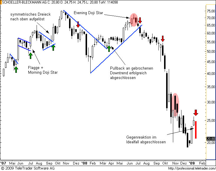 Charttechnischer Ausblick 18.01.09: Mit einer Gegenreaktion war zu rechnen im Wochenchart von SCHOELLER-BLECKMANN nach den harben Verlusten. Diese könnten wir nun gesehen haben, zumindest sprach die hinter uns liegene Handelswoche eine klare Sprache. Und die besagt, dass neue Tiefs bevorstehen. Ein Black Marabuzo auf Wochenbasis sieht man nicht so oft, hier ging es jüngst nur in eine Richtung, und zwar abwärts. Erst über 25€ besteht die Chance auf eine nachhaltige Erholung, unter 20€ wird der Frühling für diese Aktie ganz schwer.
