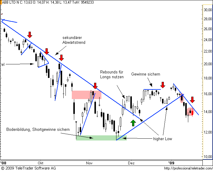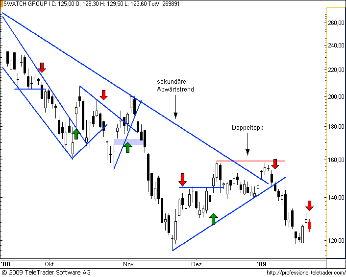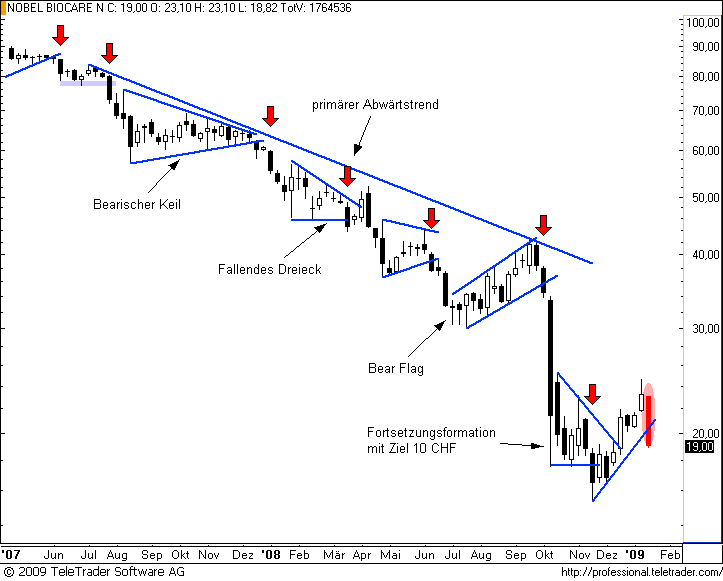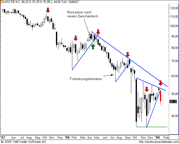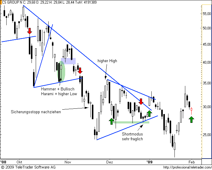 Charttechnischer Ausblick 18.01.09: Letzte Woche schien es noch, als mühe sich CREDIT SUISSE im Wochenchart über den Abwärtstrend. Eine wirklich bullische Kerze blieb aber aus. Umso signifkanter ist nun dafür der Rückfall unter die wichtigen Unterstützungen bzw. die Trendlinie des Fortsetzungsmusters der letzten Wochen. Daraus ergibt sich sofort weiteres Abgabenpotential, vor allem ab 24 CHF. Konservativere Trendfolger warten ein Schlusskurs unter dieser Marke ab, aggressive Trader müssten aber jetzt schon mit von der Partie sein.Der Autor ist in den besprochenen Werten zumeist selbst investiert. Traden auf eigene Gefahr, Signale sind aktuell großteils experimentell zwecks Challenge "In 30 Tagen zur Trading Strategie".