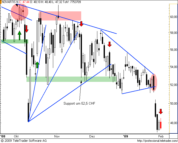 Charttechnischer Ausblick 18.01.09: Die wochenlange zähe Seitwärtsphase nach dem volatilen Spätherbst könnte wieder in mehr Dynamik übergehen. Zumindest ist charttechnisch eine klare Schwäche erkennbar nach der hinter uns liegenden Woche. Eher etwas für Rangetrader denn Trendfolger, sollte als Ziel doch das Tief um 36 CHF ein zufriedenstellendes Ergebnis sein. Bullisch wird es ab 54 CHF, bis dahin ist es noch ein Stück.