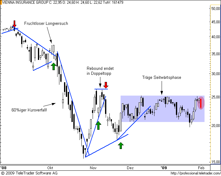 Charttechnischer Ausblick 18.01.09: Schönere Wimpel sieht man selten als gerade im Wochenchart von RAIFFEISEN. Dieser wurde in Richtung des dominierenden Abwärtstrends aufgelöst, und sorgt damit logischerweise für ein erneutes Einstiegssignal für Trendfolger. Überhaupt "glänzt" diese Aktie mit relativer Schwäche im Vergleich zum ATX, das neue Allzeittief bedeutet leider nichts Gutes. So muss man den Angriff auf einstellige Kursverhältnisse im Hinterkopf behalten. Entwarnung gibt es erst wieder über 20€.