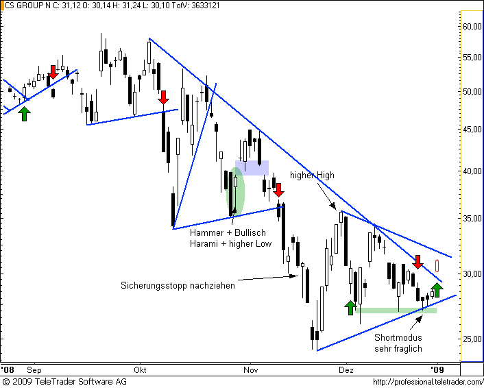 - Credit Suisse wirkt sehr dynamisch, und auch schon über der Abwärtstrendlinie, wenn man den 21.10. ignoriert