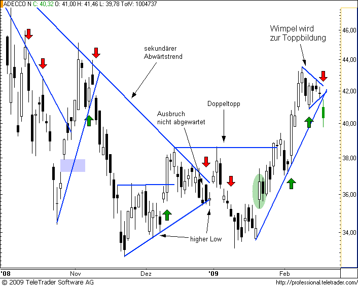Die Dynamik des weltweiten Kursverfalls ließ heute zwar zu wünschen übrig, von einer beginnenden Gegenwehr kann aber noch keine Rede sein. Solange sich nicht mindestens ein Doppelboden ausformen kann im ATX oder SMI, werden wir unseren Fokus weiterhin auf bearische Fortsetzungsmuster ausrichten. Einzelne Aktien mit relativer Stärke können aber durchaus schon mit Kaufsignalen aufzeigen, wenn sich eine allgemeine Gegenreaktion gerade erst andeutet. Wenn wir solche Signale entdecken werden wir rechtzeitig im Voraus auf bevorstehende Trades hinweisen. Für unsere Shortpositionen war das heute natürlich wieder ein sehr angenehmer Tag: