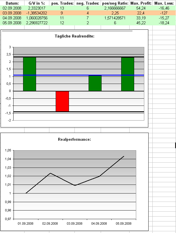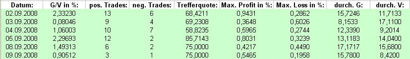 Hier sind die Ergebnisse nach den ersten 4 Handelstagen. Der grosse Verlust von -127 (rund 2 % bei 6000 k Testkapital) ist durch einen falsch gesetzten Stop entstanden.