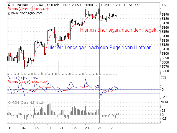 Hat die Kerze im Chart den EMA geschnitten und der CCI den SMA von unten nach oben geschnitten und das mom muß größer sein als die vorstunde. dann gehst du long, bei short umgedreht.