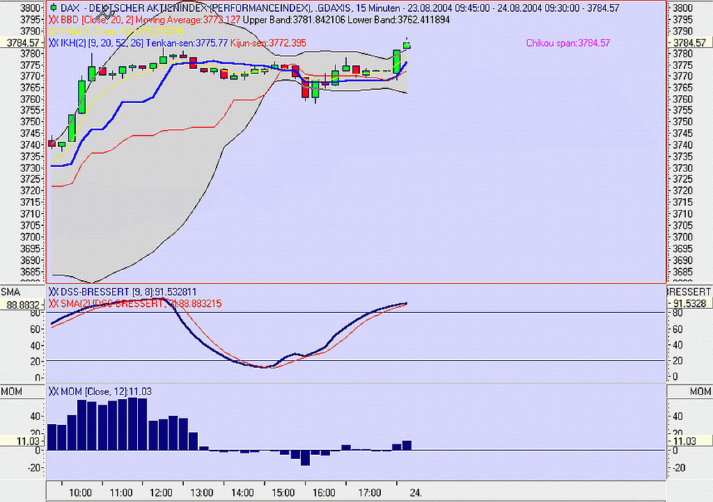 CCI-Schnitt steht wohl an, Mom steigt, wir stehen über EMA5. Sind nur leider überkauft. Kurzfristig, als auch im Tageschart. Potential sehe ich zunächst nur bis 3800.The Market will do the most obvious thing in the most unobvious manner