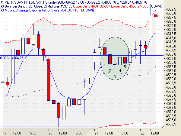 Beim Fraktal zählen nur die Hochs und Tiefs der Kerzen. Im beschriebenen Fall ging es um eine untere Umkehr, daher nur die Tiefs betrachten. Die Tiefs 1, 2 und 3 waren jeweils tiefer, 3 am tiefsten. 4 und 5 jeweils höher. Im 15 Min Chart ist das nicht so aber fast. Ich hatte auch, glaube ich, nicht davon gesprochen, daß in der Zeitebene ein Fraktal auftrat. Kann mich auch irren, muß die Postings noch mal lesen.
