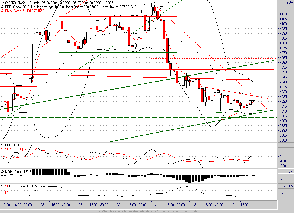 Long verkauft bei 4000 da Aufwärtstrendlinie gebrochen. Shorteinstieg (Switch) leider verpaßt.Die Kerze bleibt bis 10 Uhr sicher rot, daher Shortsignal aber kurzfr. schon sehr weit gelaufen. Warte ab.