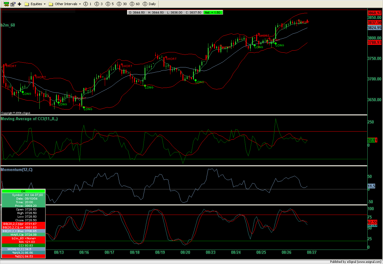"(Hintmans) Kommentar: Aktuell teste ich auch Exponential Moving Averages im Chart, um kleine Formationen, die an diesem Widerstand abprallen, ignorieren zu können. Da oft danach gefragt wird, hier die Grundeinstellungen für den Dax 60min: CCI 11, darauf ein SMA 8. MOM 12, Bollinger Bänder 20, EMA 5 wird gerade getestet. "