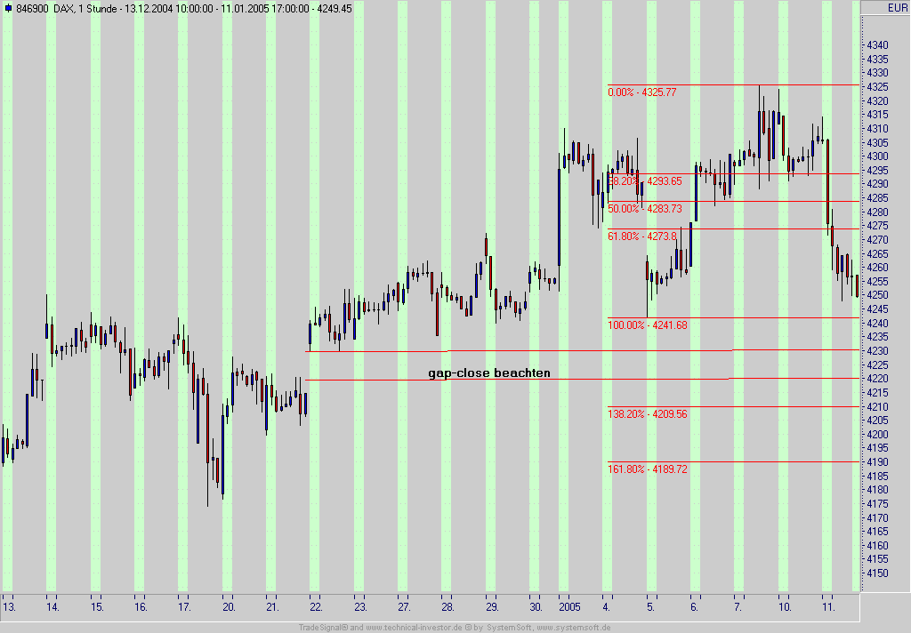 ich glaube,dass systeme und die augen der trader auf bestimmte zeichen achten. wenn die 4241(100% fib.ret.) fallen,wird auf das gap geachtet und auf das 138.20% fib.ret.