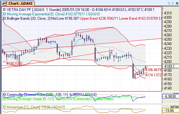 Laut den Indikatoren hatten wir zwar bei der 14 Uhr-Kerze einen CCI-Schnitt, aber ein leicht fallendes Momentum (-33 auf -37) und es erfolgte die Kerzenformation Bearisch Harami.