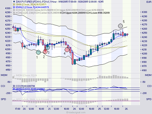 Man kann nun allerdings auch feststellen, daß es genügend Fälle gab, in denen der Fdax eben doch nach 18 UHr Signale gegeben hatte (z.B 4 auf dem Chart), die man nur deutlich ungünstiger am nächsten Morgen hätte handeln können.; sodaß ich denke, daß Beispiel 2 als die ungünstige Ausnahme angesehen werden muß, und in jedem Fall von dem positiven Effekt des Handelns nach 18 Uhr übertroffen wird.