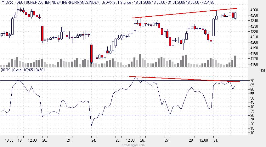 An dem RSI kann man es ersehen, das dem Markt langsam die Puste ausgeht, weil das aktuelle RSI sowohl im DAX als auch FDAX niedriger notiert als am 26.01 und das obwohl die Kurse höher stehen.