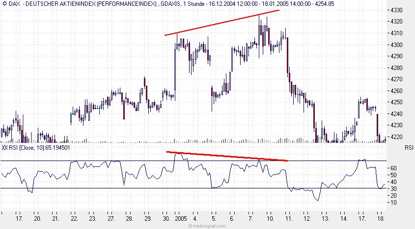 Am Chart sieht man das dem DAX die Puste ausgeht, oder wie es L. Williams formulierte "Achten Sie auf Divergenzen" oder "The market ran out of steam".