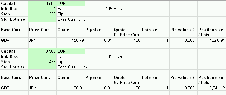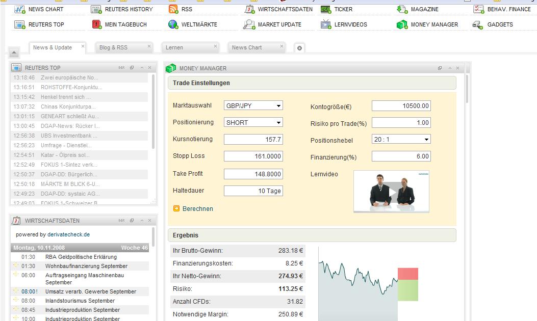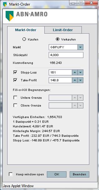 zurzeit nutze ich verstärkt die Handelsplattform von ABN AMRO. Da ich nicht immer vorm PC sitzen kann, nutze ich Limit Orders zum Einsteigen. Um meine Verluste möglichst auf 1% der Kontogröße zu begrenzen, habe ich die "Money Manager" Funktion im Marketindex Cockpit ausprobiert. Hier wird mir angezeigt das ich ca. 32 CFD´s verkaufen kann und so nicht mehr als 105Euro riskiere. (Hebel 20:1)
