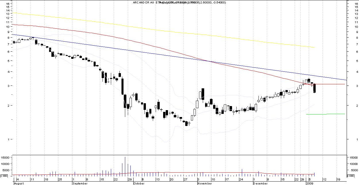 1) Arcandor, Entry zu 2,6, SL bei 3,08, TP bei 1,68