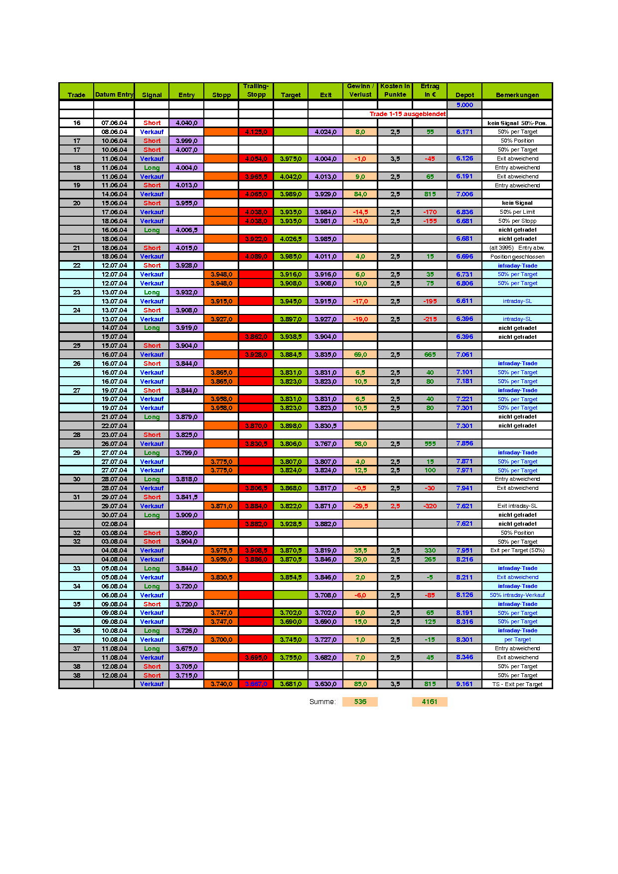 Nun begann der Run auf das offene Gap im Dow-Future (10160) sowie die mögliche Short-Sequenz ca. 35 min früher als angenommen. Der Dax-Future hat in dieser kurzen Zeit 20 Punkte zugelegt und somit fast am Eröffnungskurs geschlossen. Insgesamt war die vorzeitige Auflösung der ersten Hälfte der Short-Position richtig und der "Mehrgewinn" gegenüber dem Signalsystem betrug etwas mehr als 200,-- Euro.