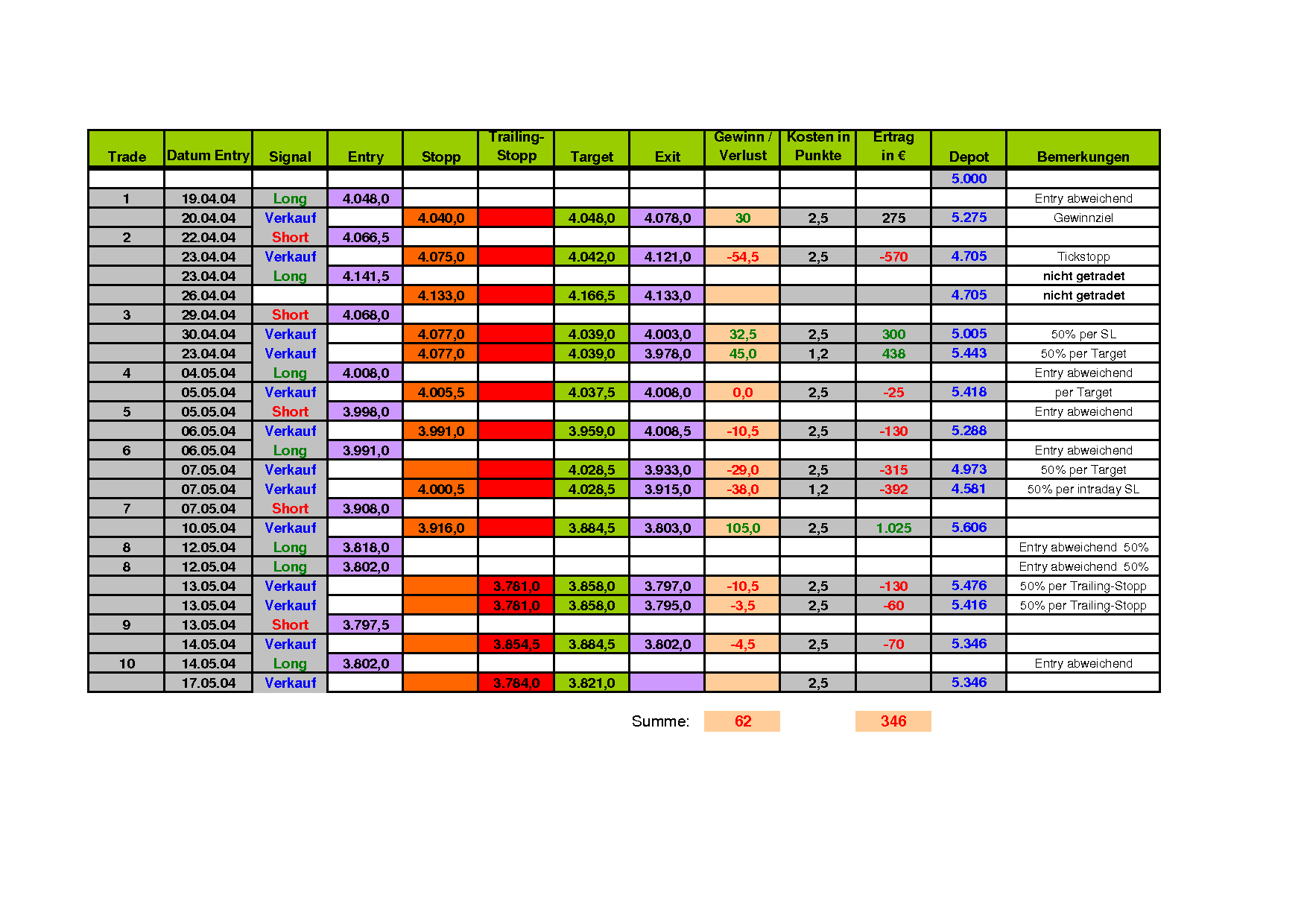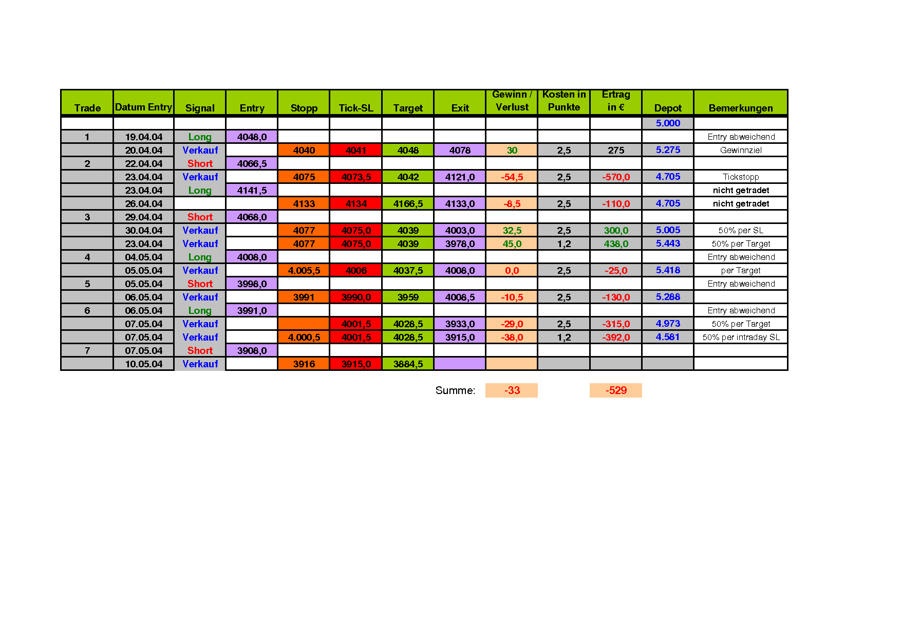 Dafür wird zusätzlich ein Trailingstopp mit eingebaut. Als "optimaler Wert" hat sich 1,5% intraday (High bzw. Low) bewährt.