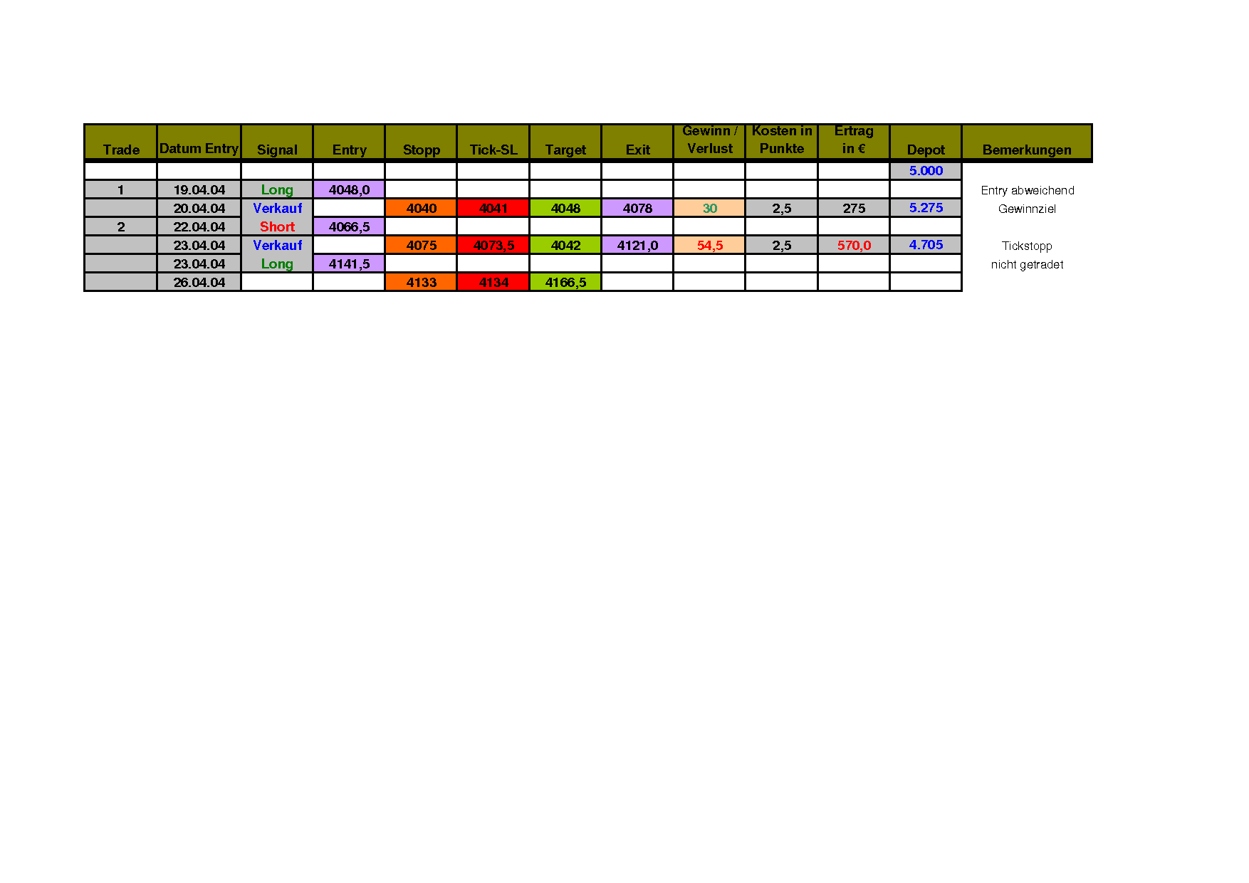 Ich werde dieses Signal aus zwei Gründen nicht Traden. Zum Einen gibt es keine Bestätigung in den Us-Indizes sowie im Dax und zum Anderen "stört" mich die mögliche potenzielle Flaggenbildung, die vollendet wäre bei Unterschreiten der unteren Flaggenbegrenzung bei aktuell ca. 3983 Future-Indexpunkten.