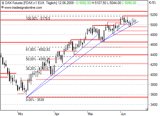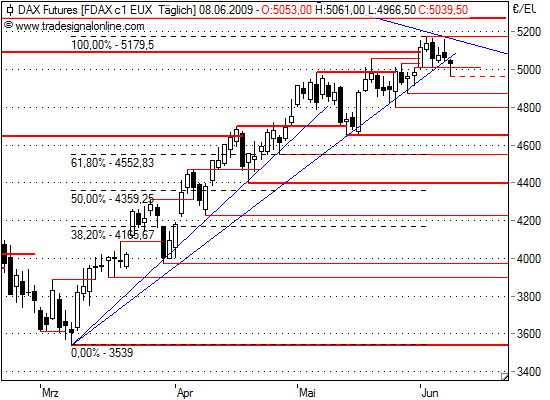 Heute sollte der FDAX wieder Land gut machen können und bis schließlich bis zum Tageshoch vom 02.06.2009, 5179, steigen. Bricht allerdings die Unterstützung bei 5017/12 könnte ein Kursrutsch bis 4920 und sogar 4804 möglich sein.