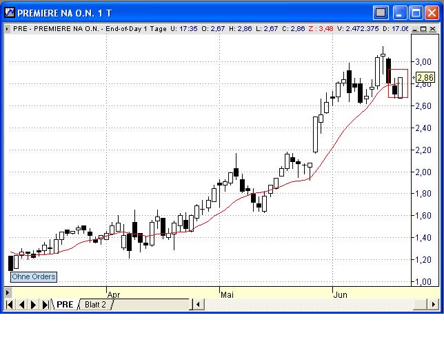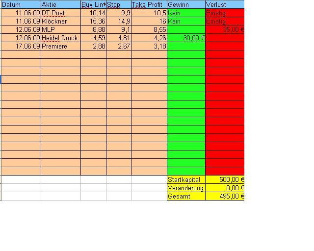 Selbstverständlich kommt es bei dieser Handelsmethode auch mal zu Verlusten. Die Strategie ist aber so angelegt, dass der eventuelle Verlust immer nur max. halb so groß ist, wie der Gewinn. Sie haben bei 10 Trades ein durchschnittliches Gewinn/Verlustverhältnis von 7 Gewinnen zu 3 Verlusten, sofern Sie sich an alle Punkte der Technik halten.