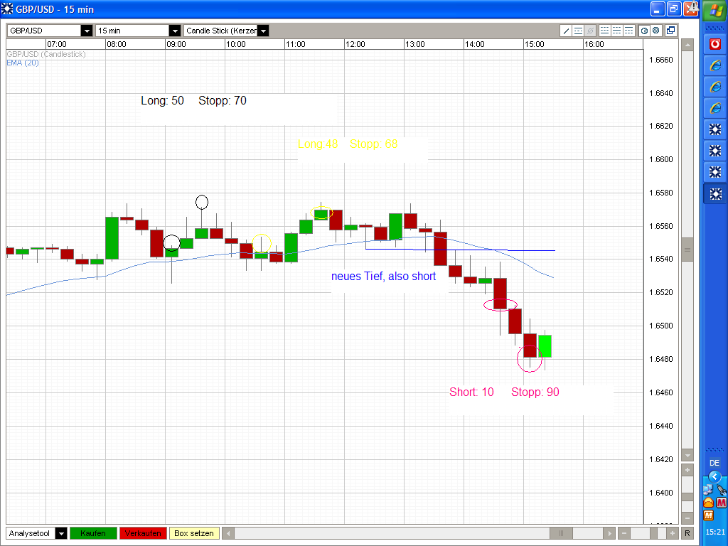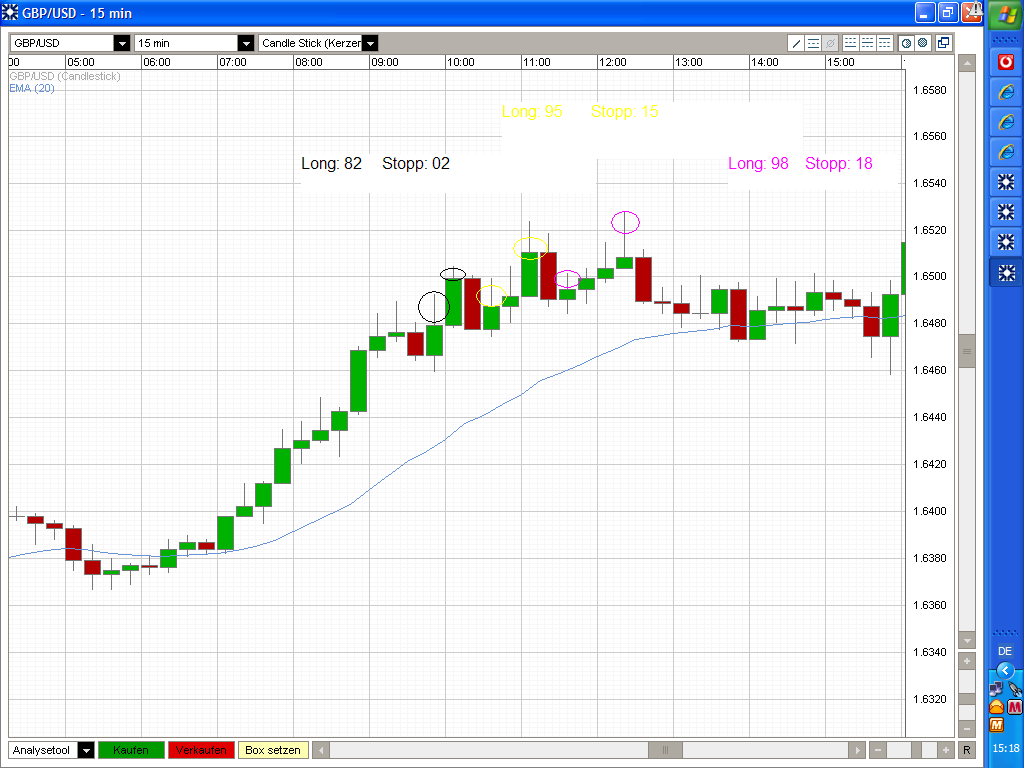 Zum Trendhandel, der ja als Setup nichts außergewöhnliches ist. Habe übrigens mein TF auf 15 verringert. Trotzdem merke ich, daß man den Trend handeln u. auf der Verliererseite sein kann. Nämlich dann, wenn man die Hochs u. Tiefs voll ausreizt. Ergibt sich bei mir wieder die Frage des Mitnehmens von Gewinnen. Vielleicht sollte sogar eine Faustregel sein, TF gleich Gewinnmitnahme. Habe jedenfalls Übereinstimmungen festgestellt. Momentan sind im 15 ner 15 P-20 P. pro Trade drin. Siehe Screenhot. Nach wie vor beschäftigt mich die Frage nach dem Sinn von Tageszielen. Läßt man es laufen oder hört man generell nach einem TZ auf? War schon des öfteren gut im Plus u. habe dann im Minus geschlossen. Auch hierzu würde ich gern Eure Erfahrungen hören. Desweiteren freue ich über Marketindextrader zum Kursvergleich. ( Ich bin wohl der Einzigste, der dort handelt! ) Möchte auch mehr Kontakt zu den Berufstradern haben. Aber dieses scheint schon so ein eigenartiges Völkchen zu sein. Kontaktmangel?