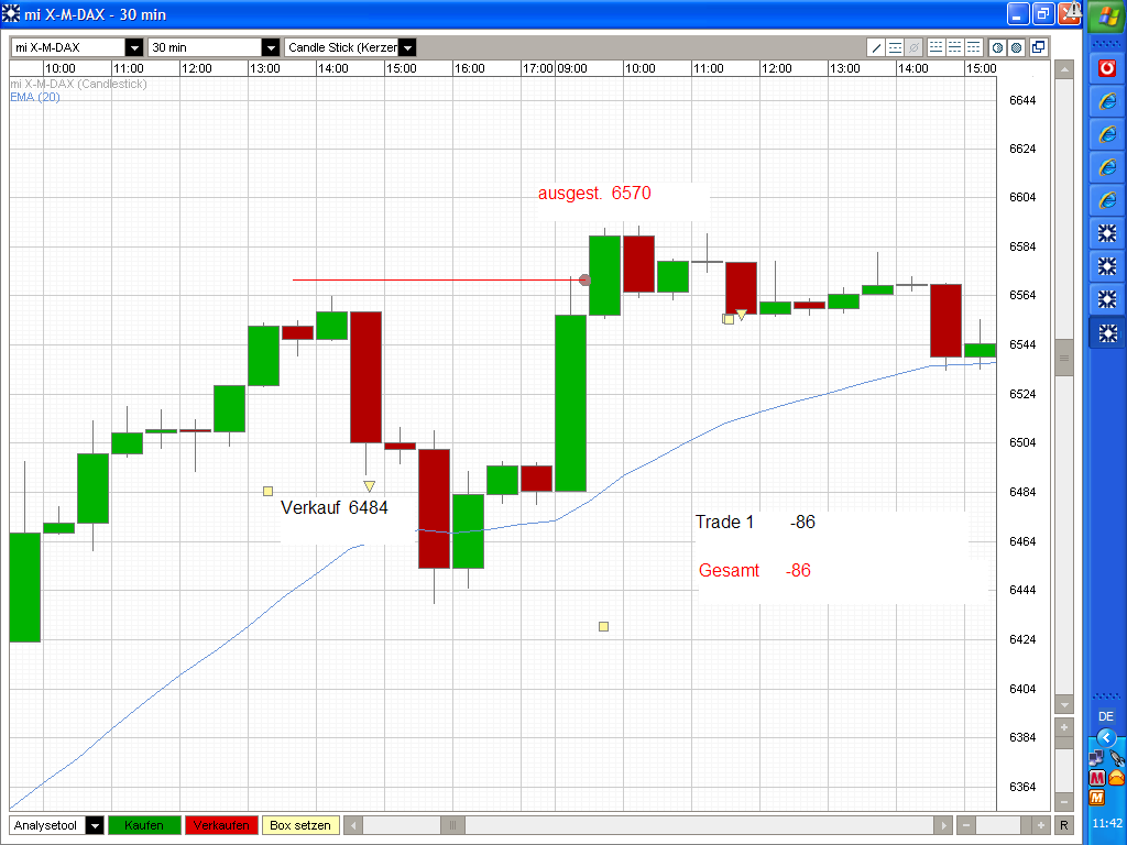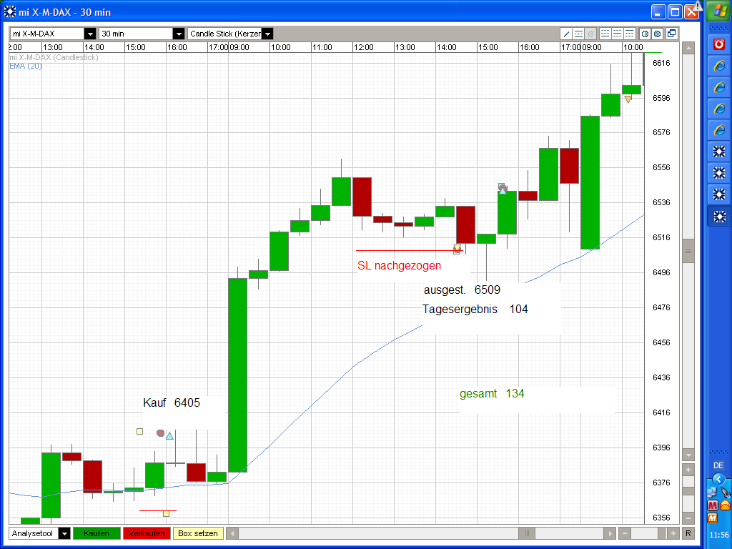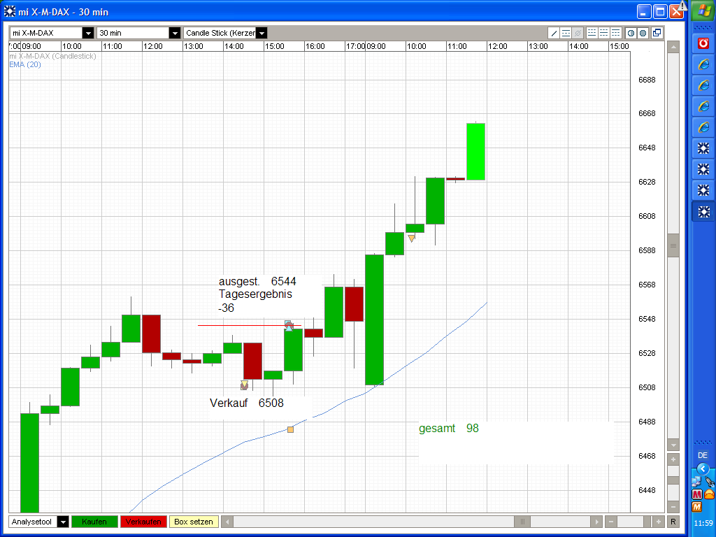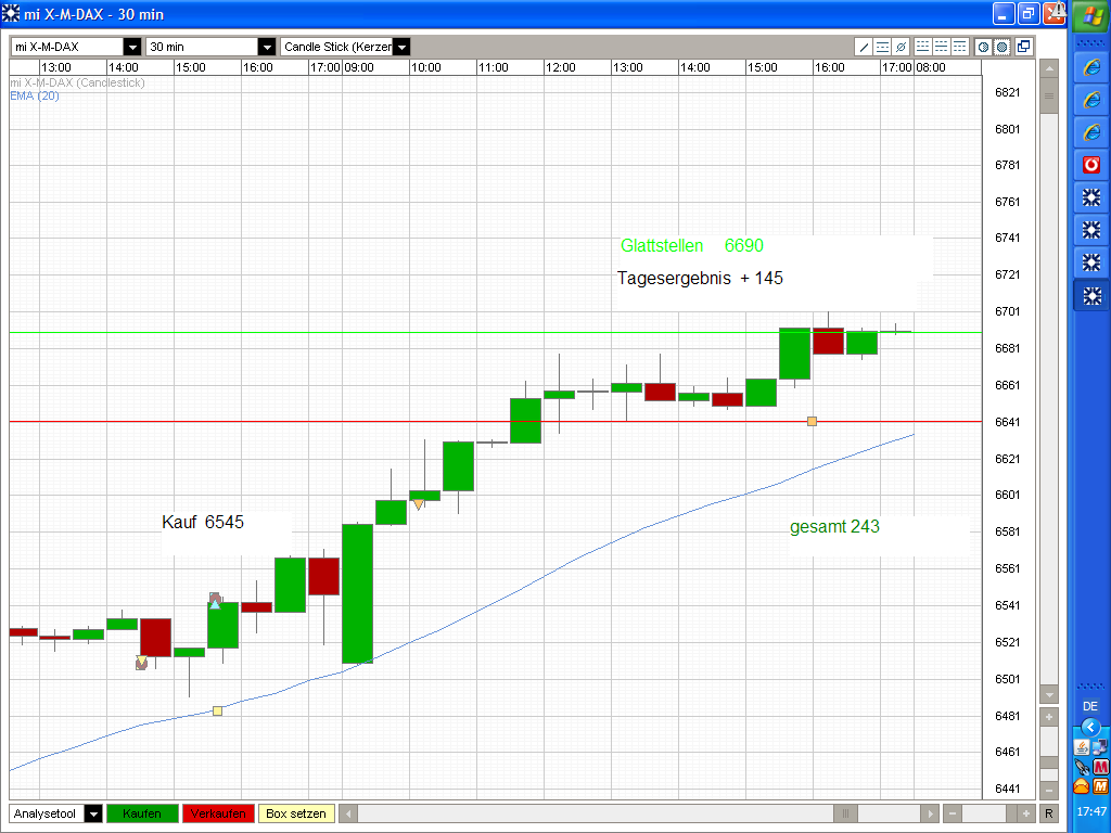 Aufmerksame Leser sehen, daß ich bei 6593 raus bin. Bin wie auch immer an die Taste gekommen. War so nicht geplant. Da ich die Profitabilität meines Systems feststellen möchte, nehme ich den geplanten Ausstieg bei 6690, nach den Regeln. Auch die Limitorder habe ich gelöscht. Warum sie noch drin ist, ist mir ein Rätsel. Aber ich sehs noch ganz locker, ist eh nur Demo.
