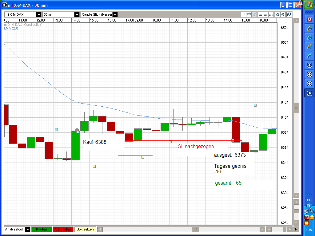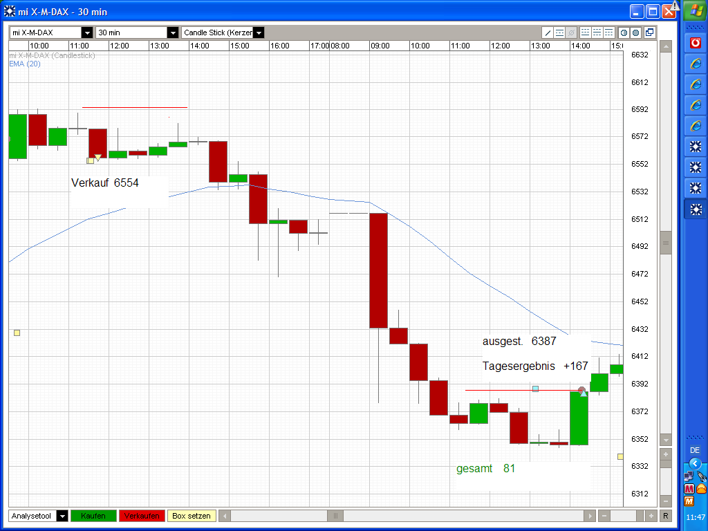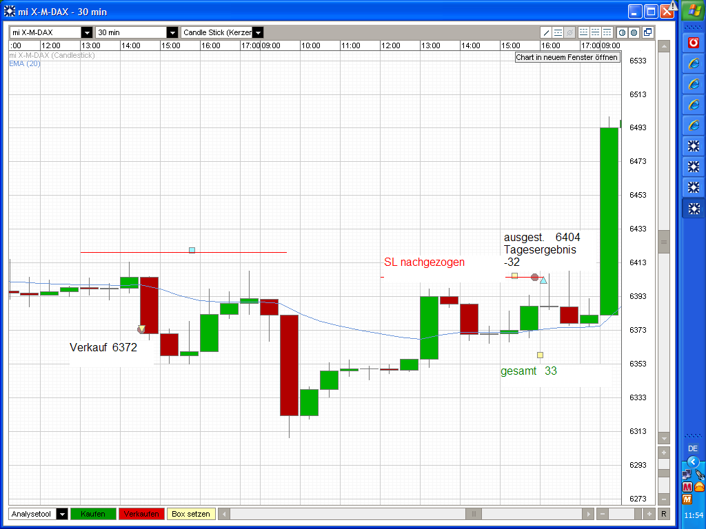 Zur Ausstiegsregel. Die Woche wird durchgehandelt. Nur am WE stelle ich kurz vor 17.30 glatt, falls ich nicht short bin. Ich denke, es gibt kaum positive Meldungen am WE, die einen Riesenkursschub zur Folge haben. Bei negativen möchte ich dabei sein.