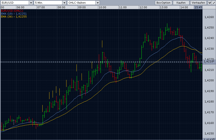 Das ist der Euro im M5, wo wir heute früh einen schönen Aufwärtstrend hatten. Nach dem Durchbruch um 7:15 (markiert mit einem senkrechten kleinen Strich) ging es los und etwa um 13:55 war es zuende. Ich habe kleine senkrechte Striche eingemalt um die Stellen zu zeigen auf die ich hinauswill.