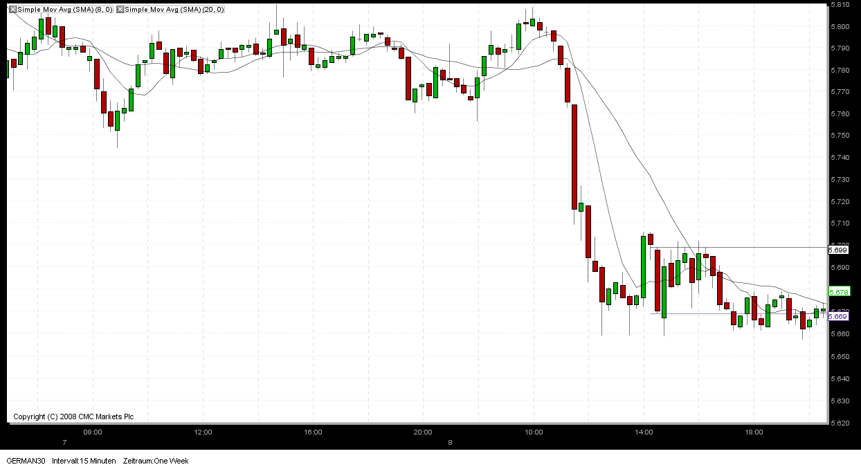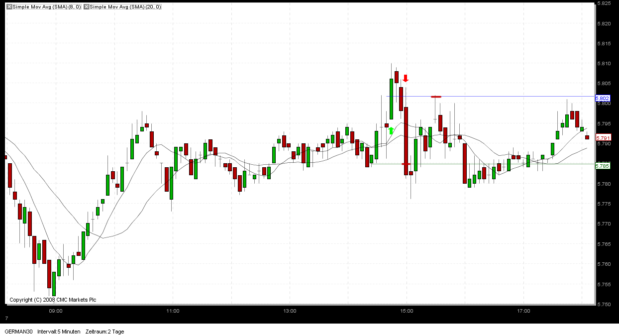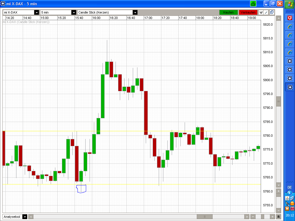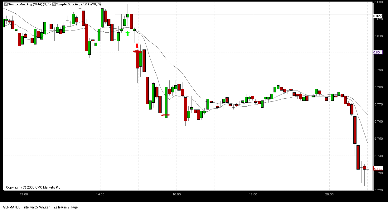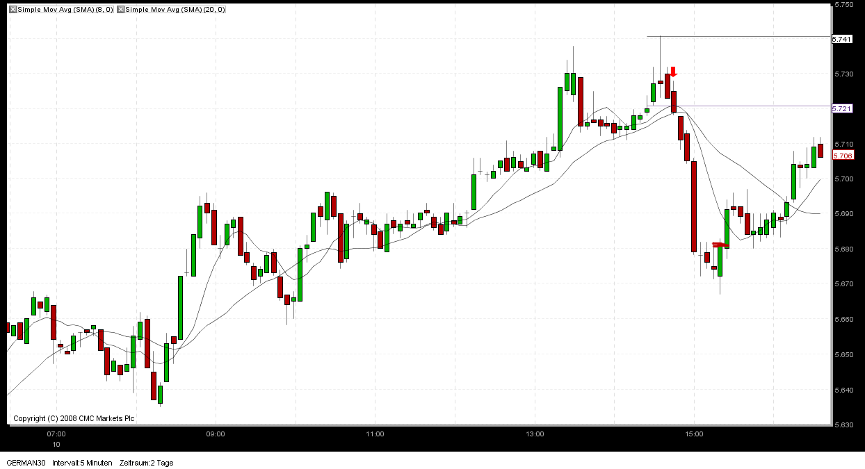 der Umkehrstab um 15.10 Uhr hat für mich insofern keine Gültigkeit, weil die vorherige rote Kerze mit einem Schlusskurs von 5728 eben nicht 10 Punkte im Gewinn lag sondern nur 8 Punkte. Hätte diese Kerze zwei Punkte tiefer geschlossen, hätte ich nach besagten Umkehrstab den SHORT-Trade geschlossen. Somit ist er leider in den SL gelaufen.