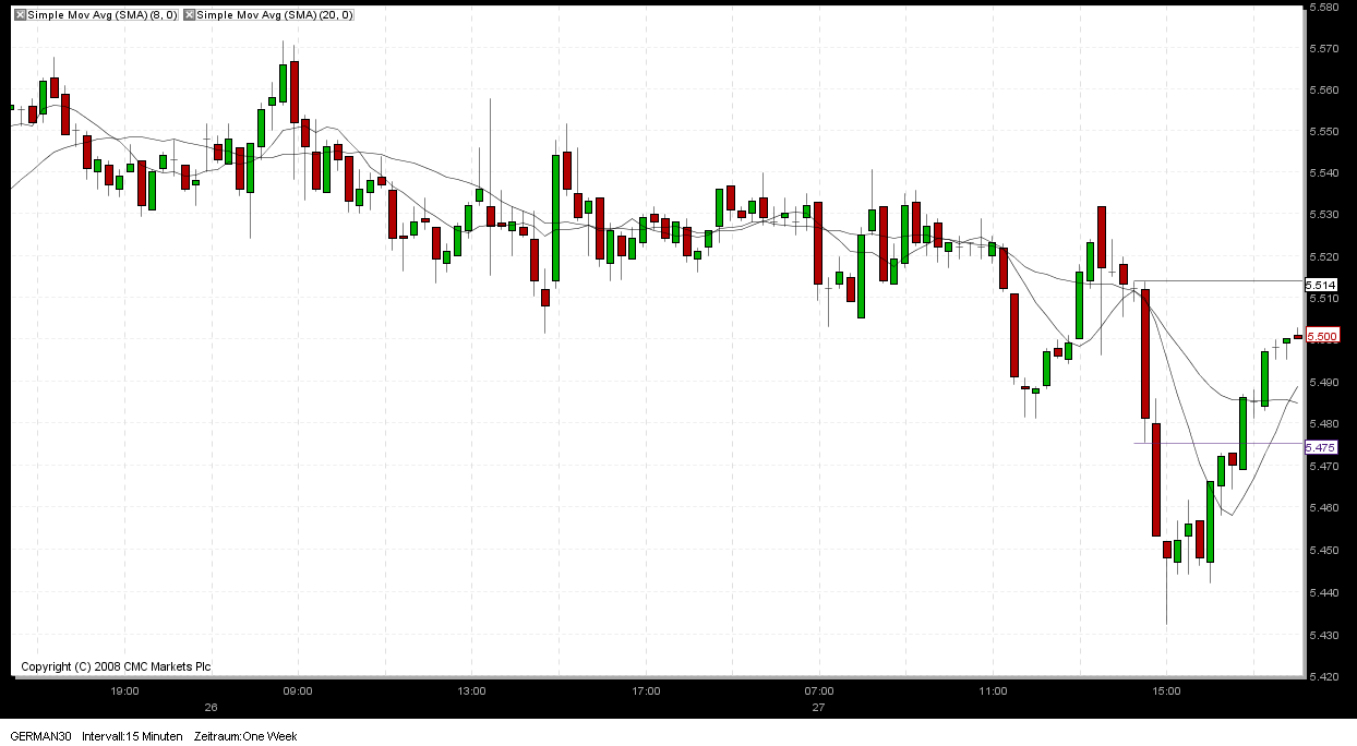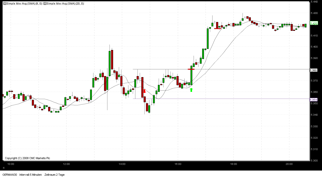 Der Trailingstopp nach Voigt (im 5 Minuten Chart) kommt erst zur Anwendung, wenn die Position mindestens 10 Punkte im Plus liegt bei abgeschlossener 5-Minutenkerze. Bis dahin bleibt der SL an der Rangegegenseite. Bei Auftreten eines Umkehrstabes wird dann die Position glatt gestellt, auch wenn dieser als Innenstab enden sollte.
