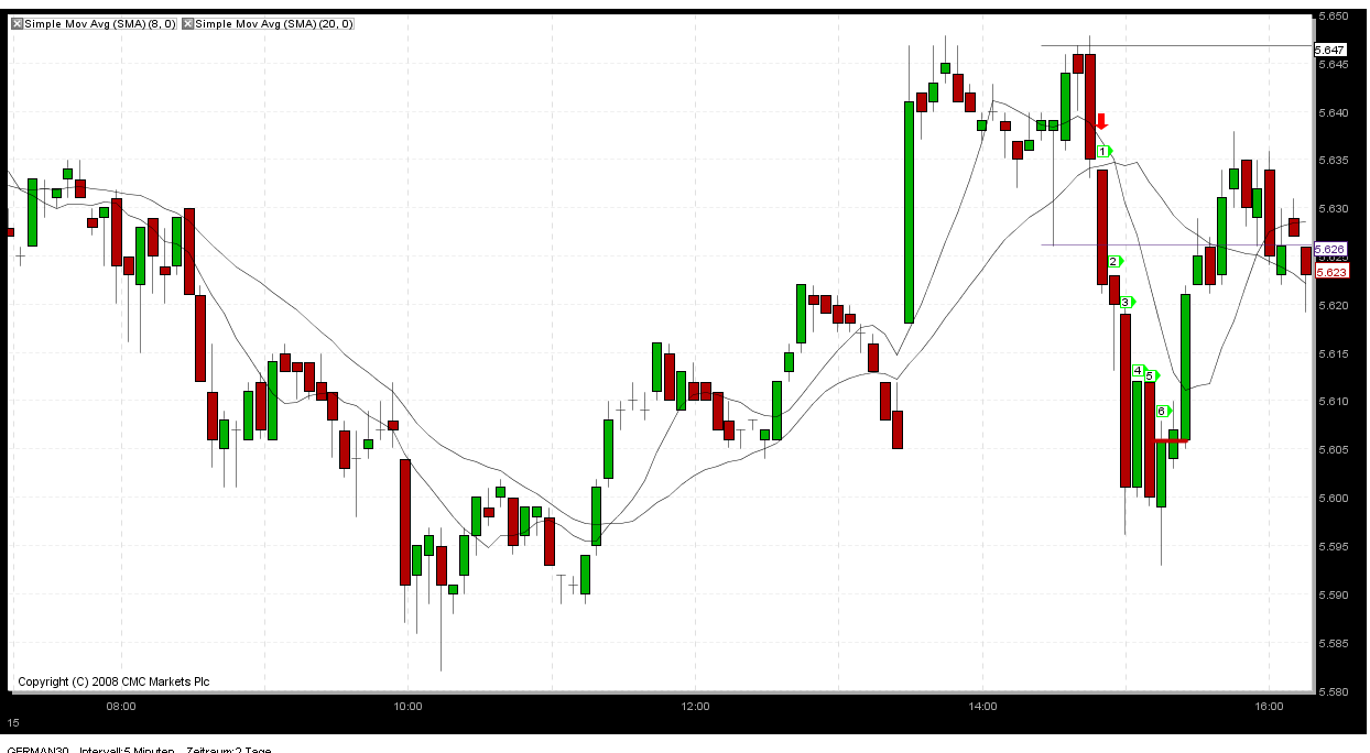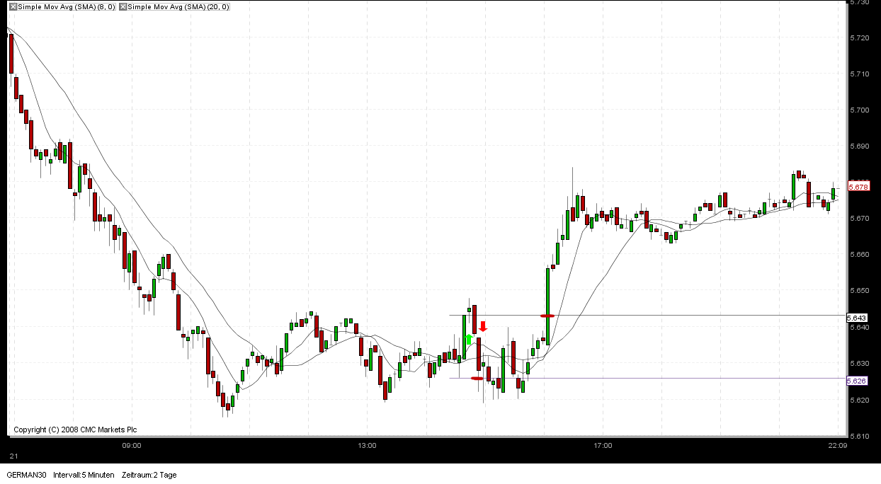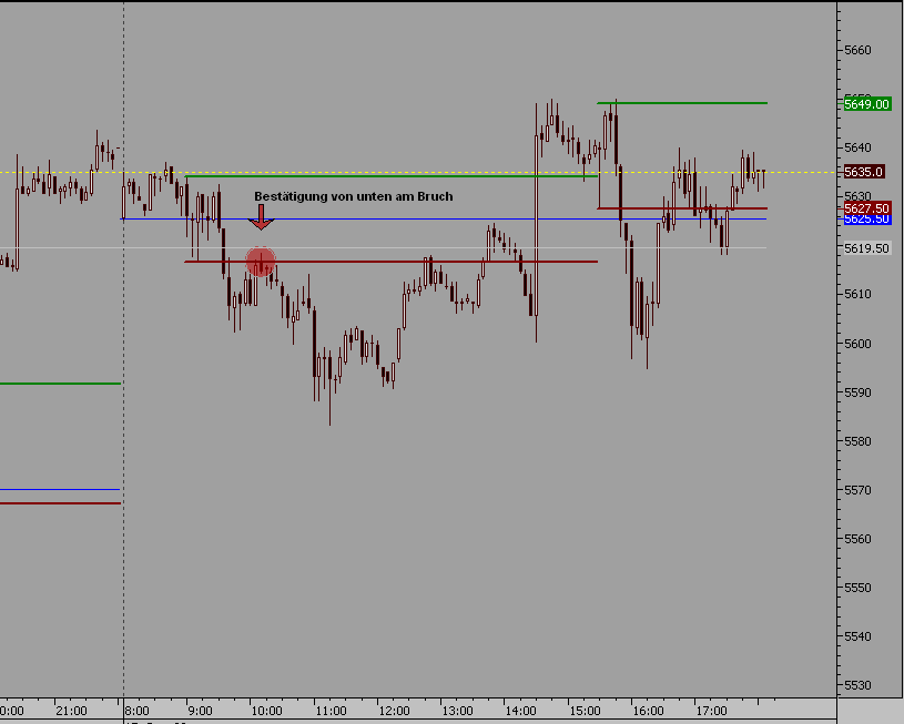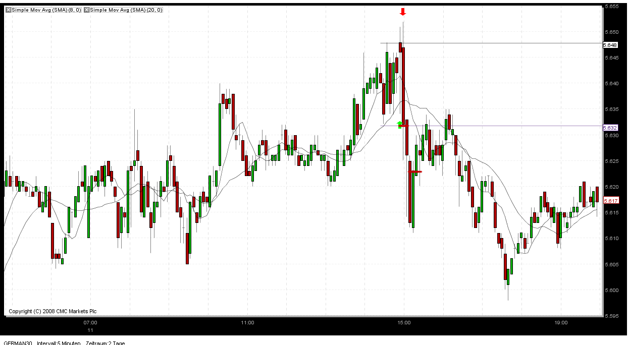 SHORT-Trade wurde bei 5624 Punkten ausgelöst (Kerze 1 im 5Min-Chart).