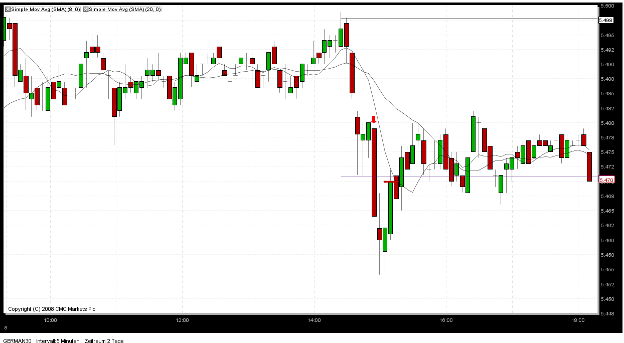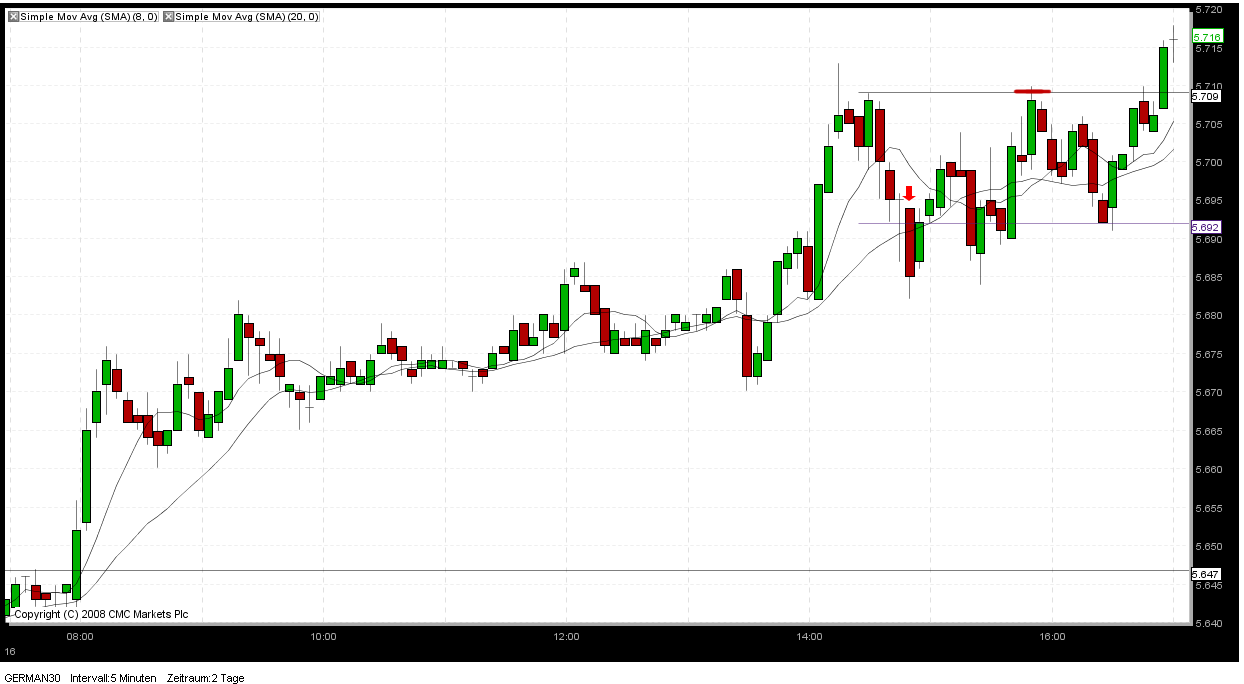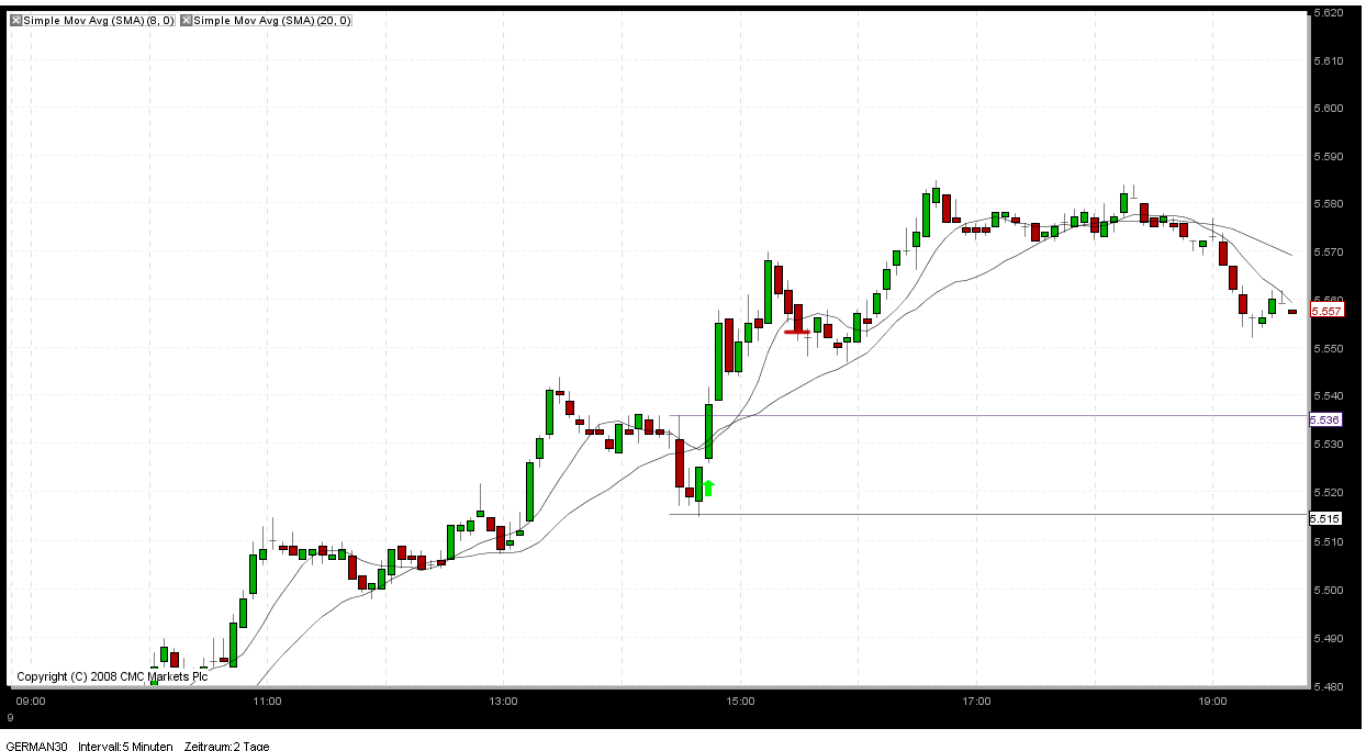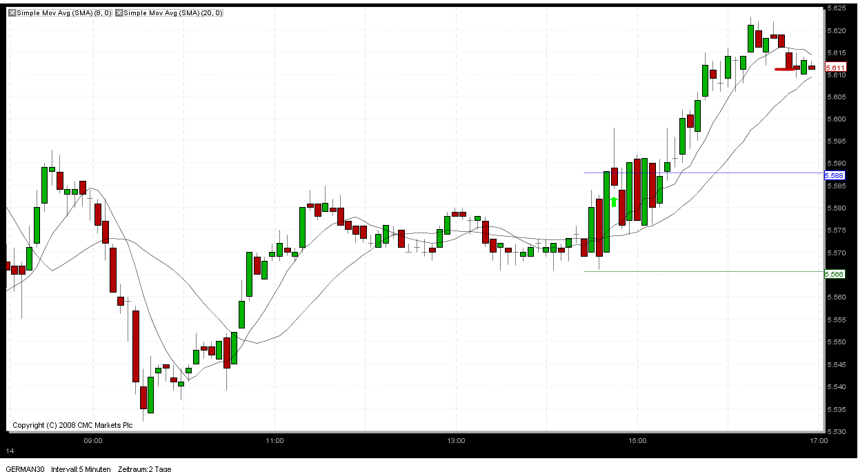 SHORT-Trade wurde bei 5624 Punkten ausgelöst (Kerze 1 im 5Min-Chart).