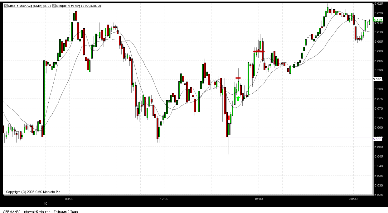 Da Kerze 6 einen Umkehrstab bildete, wurde der Trade zum Schlusskurs von Kerze 6 bei 5606 Punkten glatt gestellt.