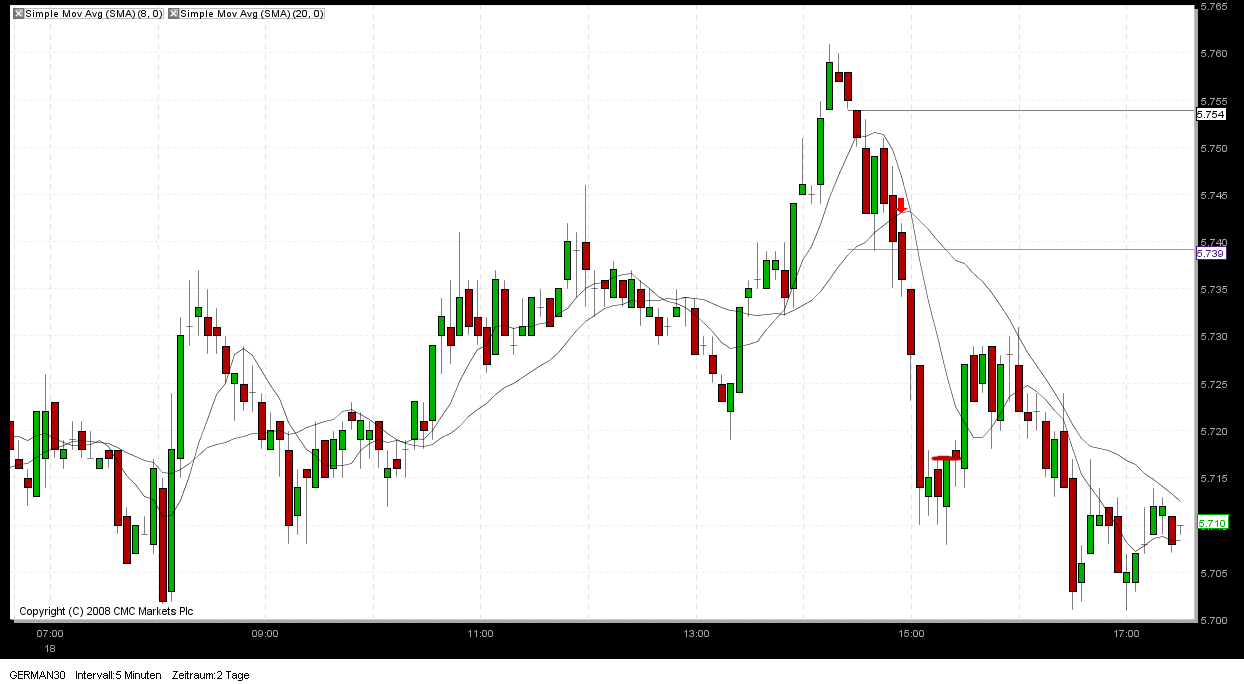 SHORT-Trade wurde bei 5624 Punkten ausgelöst (Kerze 1 im 5Min-Chart).
