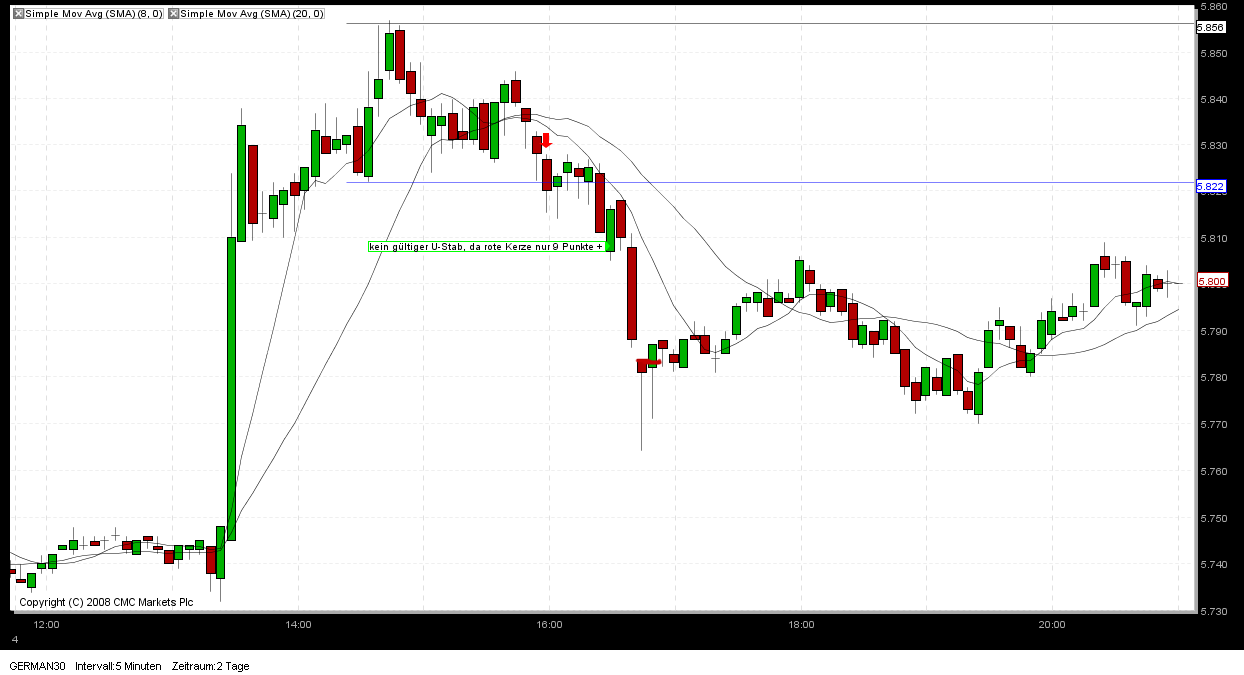 der Umkehrstab um 15.10 Uhr hat für mich insofern keine Gültigkeit, weil die vorherige rote Kerze mit einem Schlusskurs von 5728 eben nicht 10 Punkte im Gewinn lag sondern nur 8 Punkte. Hätte diese Kerze zwei Punkte tiefer geschlossen, hätte ich nach besagten Umkehrstab den SHORT-Trade geschlossen. Somit ist er leider in den SL gelaufen.