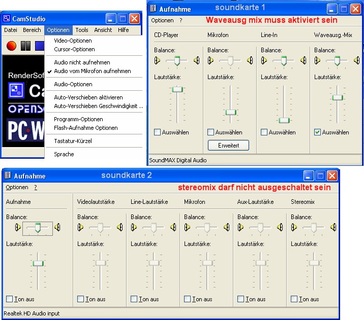 Ich sehe gerade beim CamStudio kann man diese Soundkarten Einstellungen auch über das Menü vornehmen.