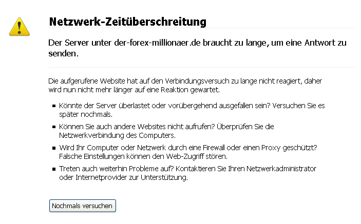 Sieht eher nach technischen Problemen aus, per ping erreiche ich 84.19.172.14 (der-forex-millionaer.de), lt. tracert ist die Webpage in DE bei kayweb.de gehostet