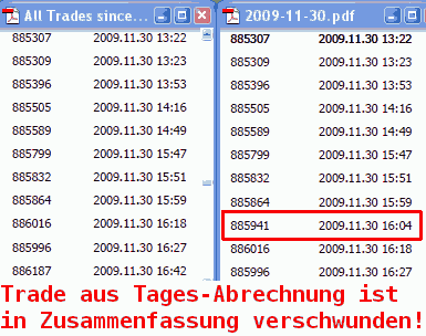 Nach der letzten Kritik der Nicht-Nachvollziehbarkeit wurde ein "Statement" für die ganze Zeit seit dem Dienstleister-Wechsel online gestellt. An dem gibt es die Merkwürdigkeit, daß ein in einem Tages-"Statement" vorhandener Trade in der Zusammenfassung nicht mehr da ist.