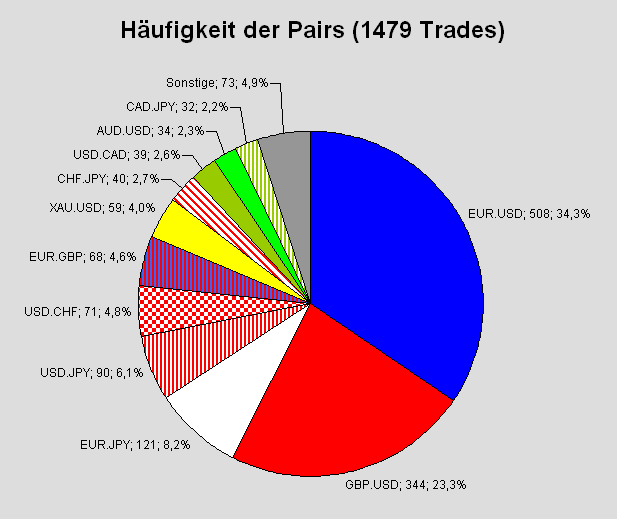 Ich habe gerade das Ratio zwischen prozentualem Anteil an Trades und Anteil am Gewinn betrachtet, dabei kommt es für mich zu wenig Überraschungen, was mich dagegen überrascht ist der Umstand, dass Kay das Trading auf manche Pairs nicht schon lange eingestellt hat, signifikant ist USDJPY, in diesem Pair wurden 6,1% der Transaktionen gemacht, an der Performance beträgt der Anteil dieses Pairs dagegen nur 0,7%, EURGBP ist auch nicht berauschend.