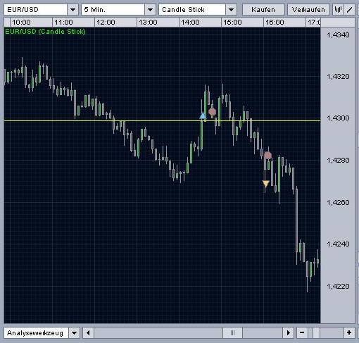 Da ich zwei Positionen besaß und für einen extremeren Abstieg die Dynamik eher fehlte, wurde die EURUSD-Position an der ersten meines Erachtens möglichen Unterstützung geschlossen.
