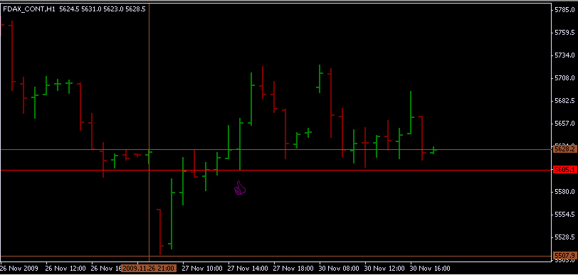 Warum die 5606 so wichtig sind. Die braunen linien ist das Gap von heute Morgen. Beim violettenDaumen, hat die Kerze es geschafft über dem Gap zu schließen. Dieses Tief von diesem Bar ist die 5606 und man sieht später auch sehr schön, wie er hier abrallt. Man sieht hier hält er wieder und geht hoch. Er sollte halt über 5627 schließen.... Bin dann wieder wech! Good Trades.