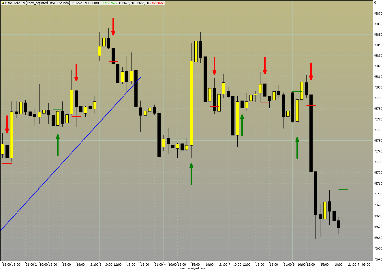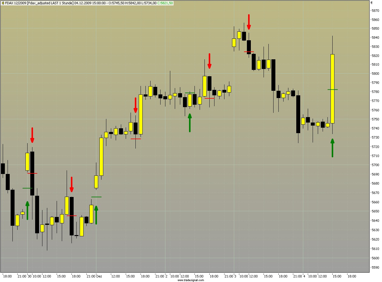 Wow, netter Antritt gerade nach den 14:30 News. Während der Tee kocht lad ich schnell mach den 60min Chart dieser Woche hoch. Bis ich mir über die Exitstrategie absolut im Klaren bin, zeichne ich bei den nicht gehandelten Signalen nur die Entries samt Trigger ein. Zäher Wochenbeginn, dann schöner Longtrade Dienstag Früh, danach aber wieder Magenbeschwerden. Das Shortsignal der 12 Uhr Kerze am Donnerstag war dagegen wie aus dem Bilderbuch, danach lecke ich mir immer alle Finger ab. Was jetzt aus dem gerade getriggerten Kaufsignal wird muss man abwarten. Gewinnmitnahmen unter 5.850 sind aber sicher nicht verkehrt, und den Stopp hätt ich mittlerweile mindestens auf Entry angehoben.