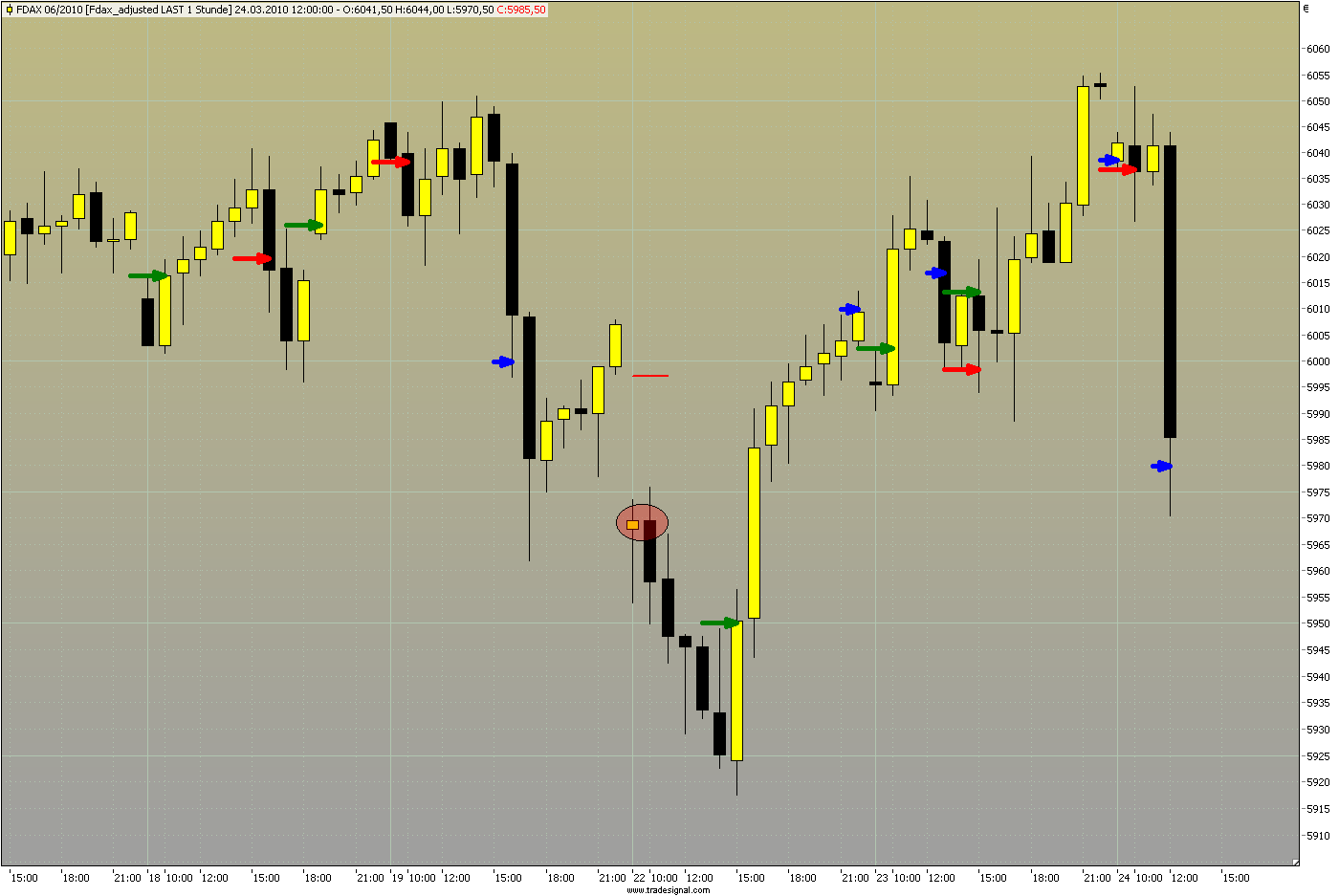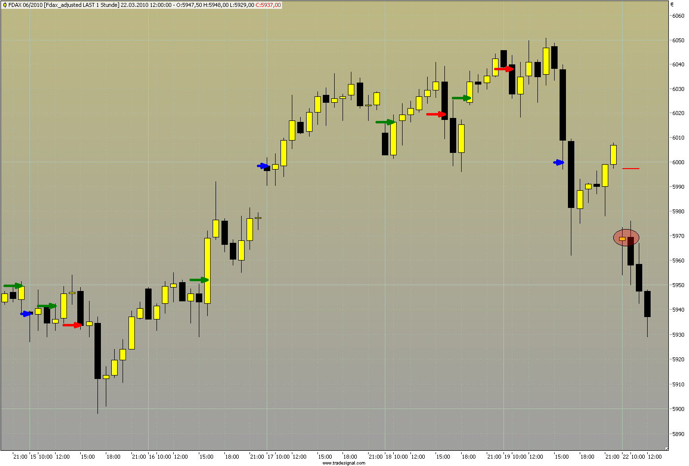 Diese Woche wurde das Soll mit +91 Punkten brutto fast wieder erfüllt. Hauptverantwortlich dafür, wie könnte es anders sein in einem übergeordneten Aufwärtstrend, die drei Longtrades je von Dienstag bis Donnerstag. Die Trefferquote bei den aggressiven Shorteinstiegen war folgerichtig unbefriedigend, diese konnten durch die Korrektur bis Dienstag Mittag aber ebenfalls Gewinn abwerfen. Etwas Glück war diese Woche ebenfalls auf unserer Seite. Hätten wir doch den Long von Mittwoch Abend zur Eröffnung Tags darauf in einen Short wechseln müssen (kleine rote Ellipse). Die Orders werden über Nacht aufgrund des 24-Handels mit erhöhtem Spread aber immer storniert, und müssen vor 08:00 neu aufgegeben werden. Das habe ich um ein paar Minuten übersehen, damit ein Fehlsignal "verpasst". Dafür heute Nachmittag aber ein paar Punkte liegen gelassen, als ich zu 5.962 außerplanmäßig Gewinne absichern wollte. Dieser Stopp wurde dann auch exakt ausgelöst, bevor es noch einige Punkte höher zum Kursziel lief.