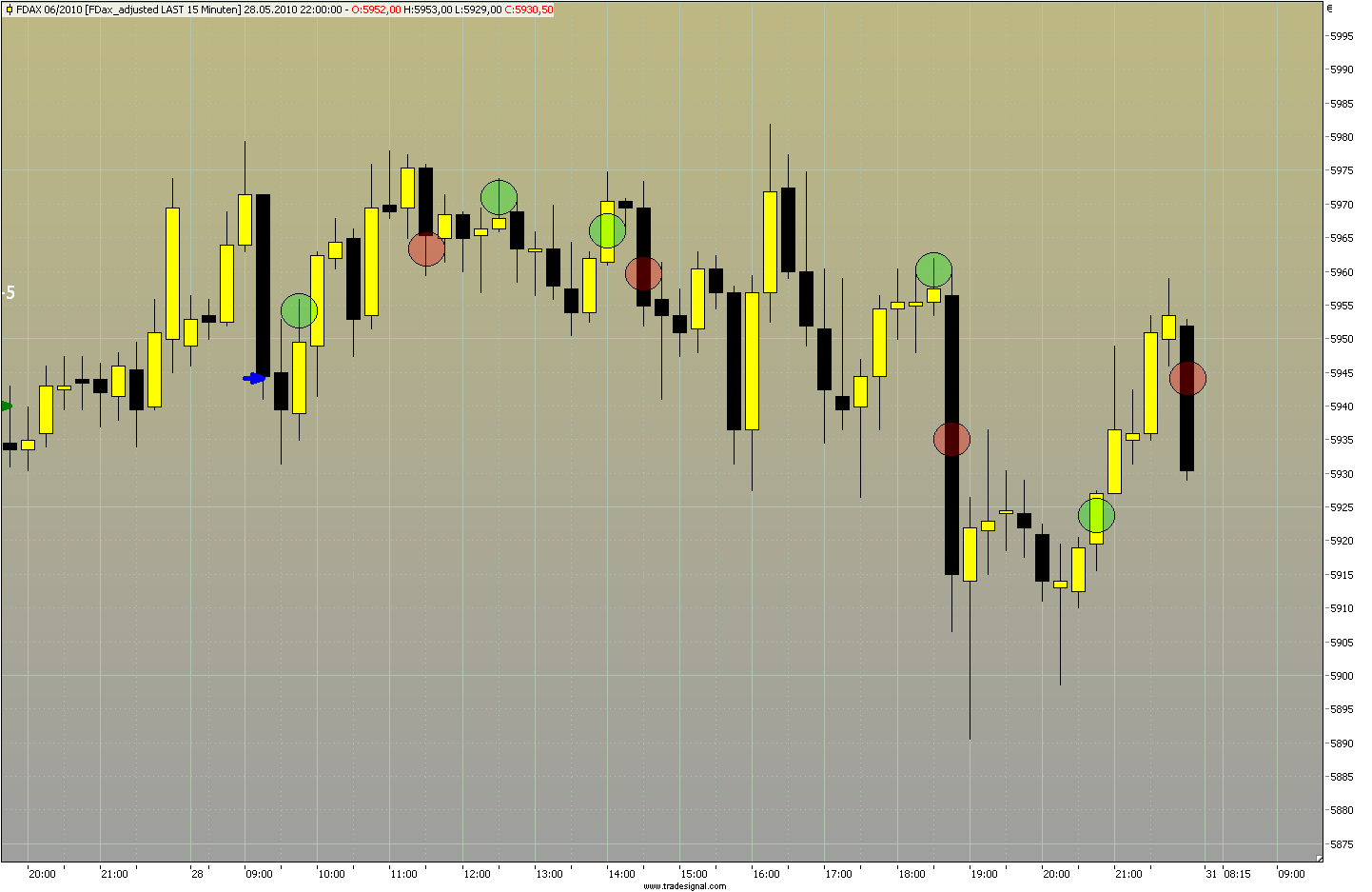Hier wurde der bis dahin laufende Short zum Fakemove erklärt, gleichzeitig neuer Shorttrigger unter dem Tief dieser Kerze auf 5.920. Kam knapp nicht zur Auslösung drei Kerzen später.