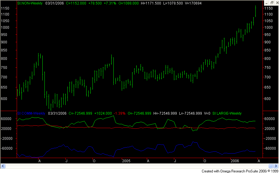 Ich würde das COT mal nicht aus der Perspektive der Netto-Position sondern aus der Perspektive der Produzenten (u.a. Silberhalter) sehen. Die sind nämlich derzeit 95008 Kontrakte short, das entspricht 475 Mio Feinunzen Silber oder 14774 metrische Tonnen. Die Weltjahresproduktion an Silber beträgt 2006 nach Gold Fields Mineral Service Schätzung wahrscheinlich 27254 metrische Tonne. Demnach haben die Produzenten over all etwa die Hälfte der Weltjahresproduktion am Terminmarkt gehedged. Diese Rate schwankt statistisch im Bereich zwischen einem Drittel und zwei Drittel.