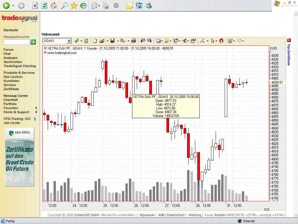 schaut euch mal den 26.10.05 die 10:00 kerze an. Dort hat bei TS der FDAX bei 4900 eröffnet, der DAX bei TS bei 4877 und CMC markets DAX hat bei 4838 pkt eröffnet. Nicht das hier einige meinen ich spinne. Sind mal eben 39 pkt zum normalen DAX.