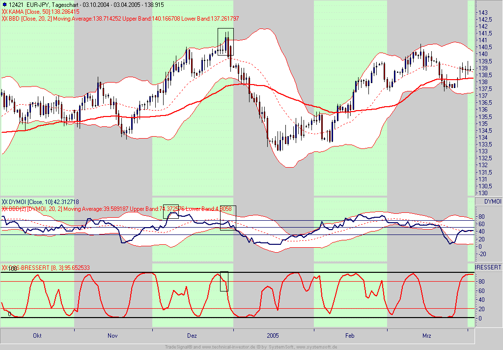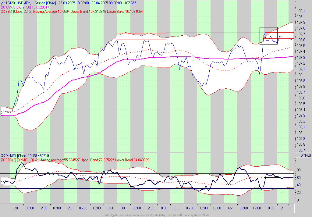 am ende eines trends laufen die candle noch einmal an die bänder,der dymoi entfernt sich von den bändern,ein beär.englf.pattern und das signal vomm DSS.