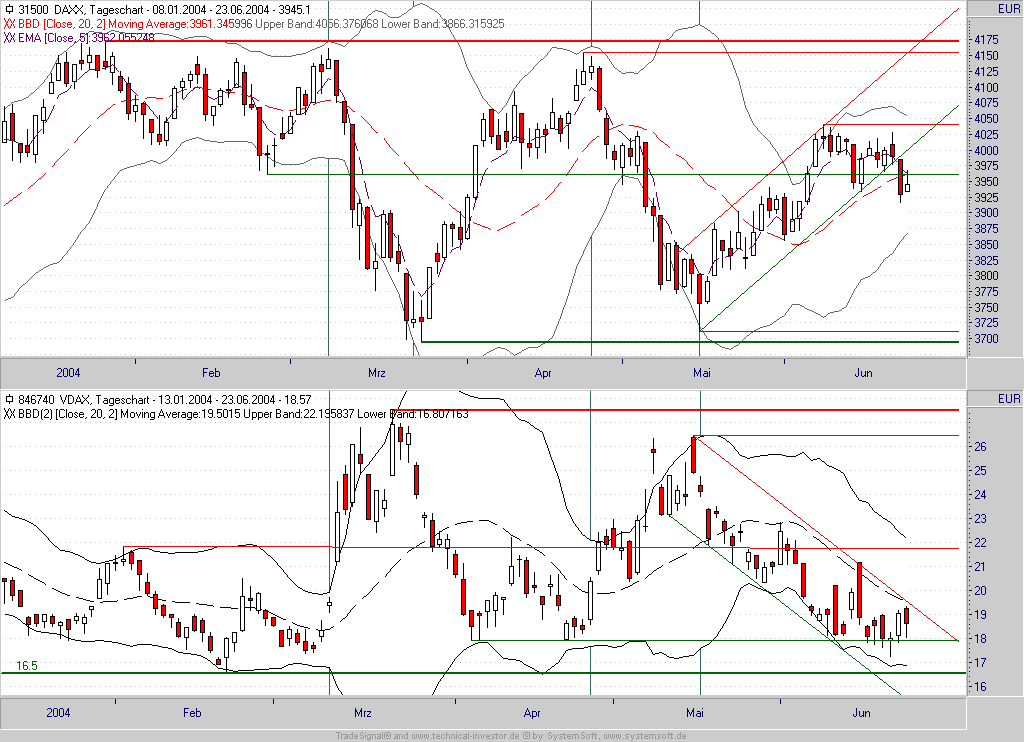 Hält die Unterstützung im VDAX bei 17,88 und steigt dieser im Anschluss an, so dürfte dies den DAX an einem weiteren Anstieg hindern.