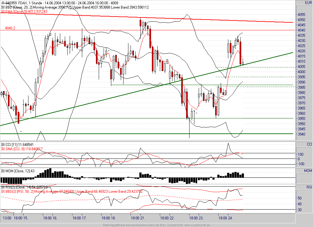 Aber hätte man heute den BB-Handelsansatz von wellington mit in seine Entscheidung mit einfließen lassen, da der RSI die neuen Hochs um 13:00 und 14:00 nicht mehr durch Ausbruch aus seinen oberen BB bestätigt hat und hätte ferner den EMA5 - der ja sowieso nur ein Hilfsmittel ist - außen vor gelassen dann hätte man mit einem Einstieg um 14:00 ein absolut top CRV mit einem SL bei derzeit 4037 im FDAX (4017 im DAX)